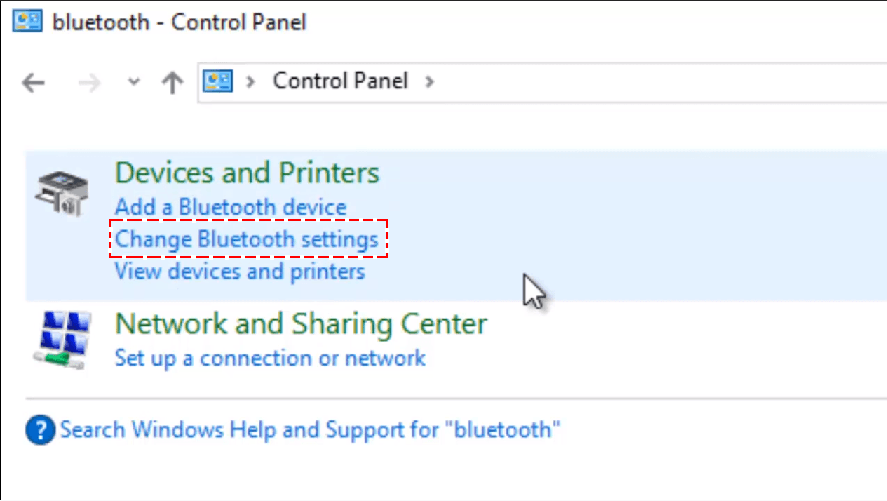 Passaggio 2. Digitare "bluetooth" nella casella di ricerca, individuare "Modifica impostazioni Bluetooth" sotto "Dispositivi e stampanti" e cliccarci sopra.