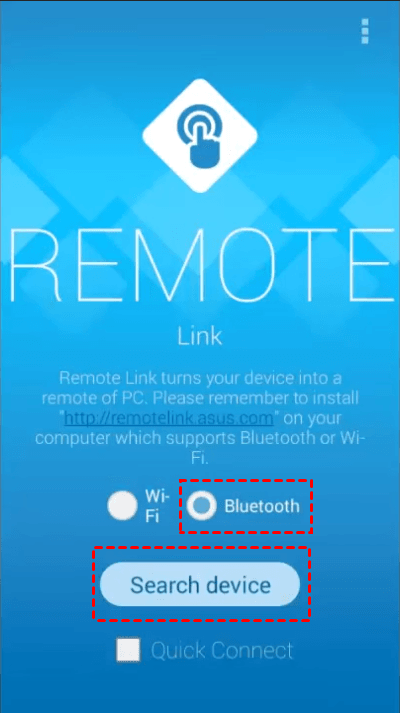 Passaggio 8. Sul tuo telefono cellulare, aprire Asus Remote Link, scegliere "Bluetooth" e fare clic su "Ricerca dispositivo".