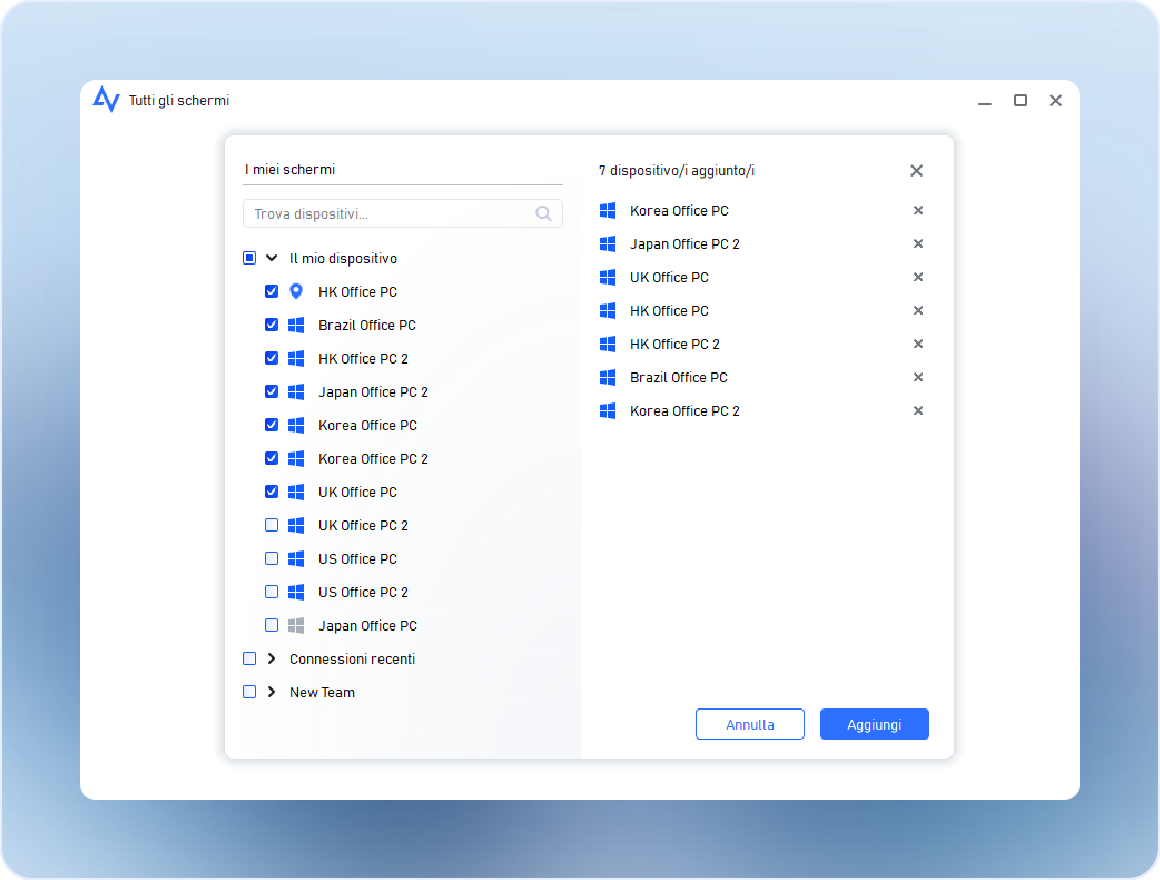 Seleziona i dispositivi che vuoi includere nel Muro schermi e clicca su Aggiungi. Ogni Muro schermi può mostrare fino a 24 dispositivi remoti contemporaneamente, permettendoti di visualizzarli e gestirli tutti senza problemi da un’unica dashboard.