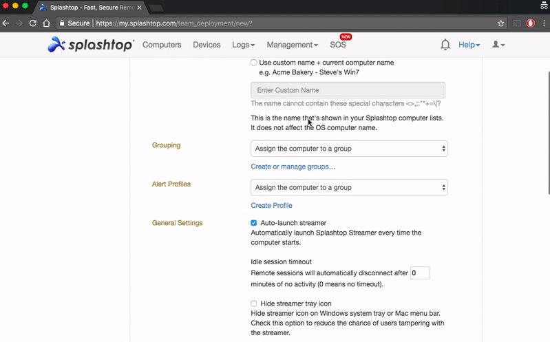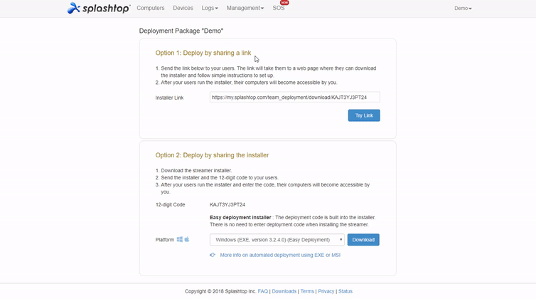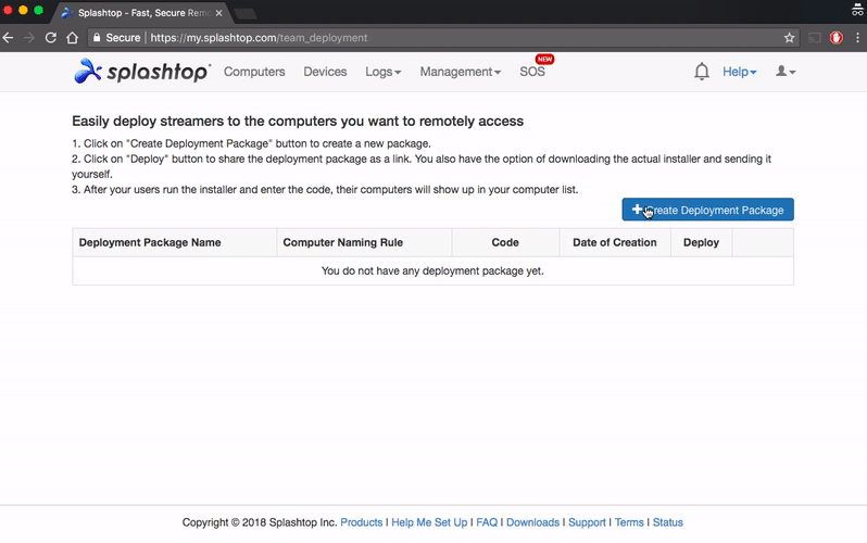 1단계. Splashtop 계정에 로그인하고 관리 섹션으로 이동한 후 배포를 엽니다. 새 배포 패키지를 생성하세요. 이 패키지에는 맞춤형 Streamer 설치 프로그램과 설치 중 필요한 설정을 자동으로 적용하는 고유한 12자리 코드가 포함됩니다.