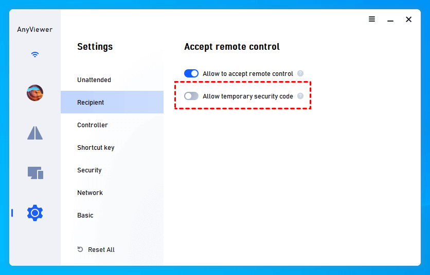 Step 1. On the to-be-accessed computer, go to Settings > Recipient. Tick the third option and then set the permanent security code.  Then, share the device ID and the fixed security code with the on the other end.