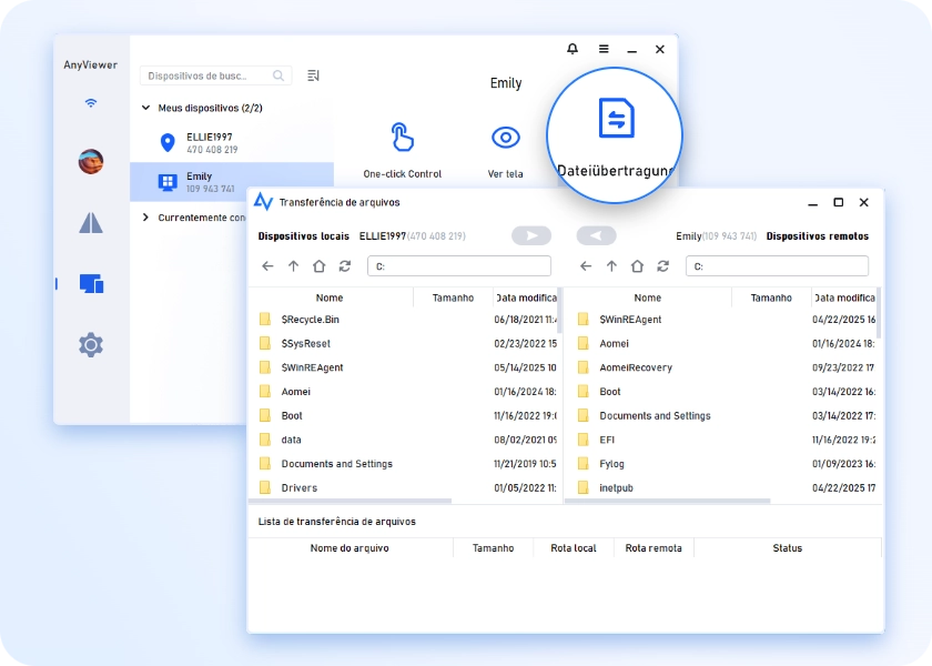 O AnyViewer facilita a transferência remota de arquivos grandes, como vídeos e dados, eliminando a necessidade de e-mail ou outro software com limitações de tamanho e soluções complexas.