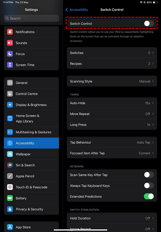 Passo 2. No seu iPad, vá para Configurações> Acessibilidade. Role para baixo e selecione Controle por Switch. Ative o Controle por Switch.