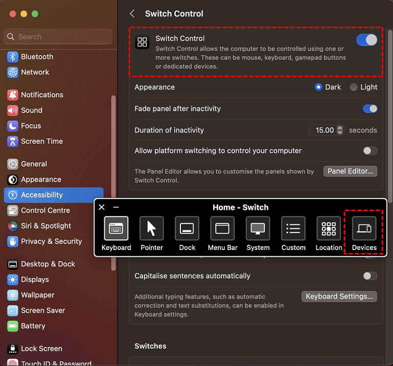 Passo 1. Acesse as Preferências do Sistema> Acessibilidade no seu MacBook. No painel da esquerda, selecione Switch Control na seção "Motor". Ative o Switch Control marcando a caixa.