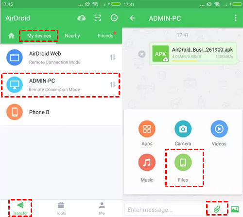 - AirDroid Personal:雙邊登入→我的裝置→選檔案傳送