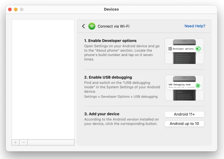 步驟2:用USB線連接Android與Mac(也可選 Wi-Fi,但需要開啟 USB 偵錯)。