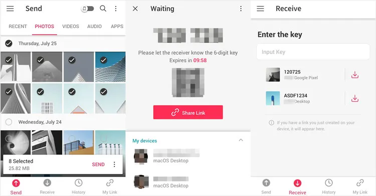 - Send Anywhere:選檔案→產生6位金鑰→另一端輸入金鑰接收
