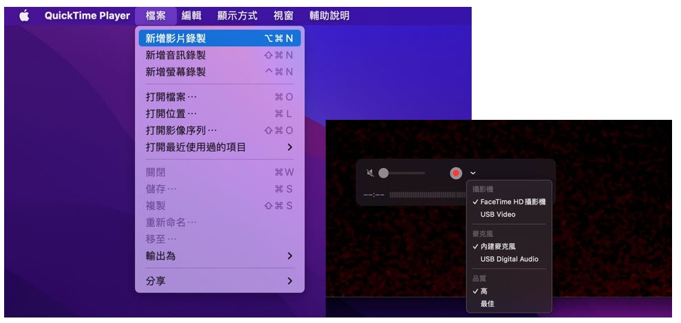 - QuickTime Player:打開應用程式→檔案→新增螢幕錄製→點擊錄製按鈕。限制:無法錄製系統內部聲音,只能透過麥克風錄外部音訊。
