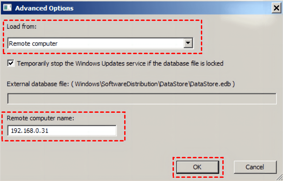 步驟1、打開WinUpdatesView,按F9打開“進階選項”視窗。然後,請選擇“遠端電腦”。輸入遠端電腦的IP位址或名稱,點擊確定按鈕。