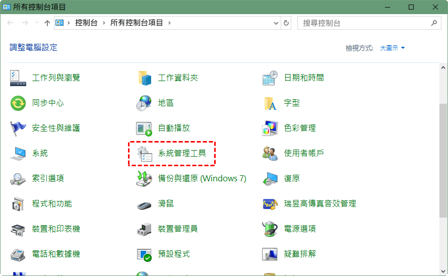 步驟4、按下Win+R,輸入“control”並打開“控制台”。從右上方切換為“大圖示”,找到並點擊“系統管理工具”。