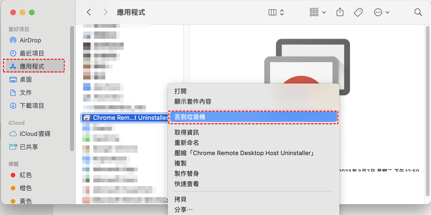2、打開Finder,從左側選擇“應用程式”資料夾。從右側視窗中找到Chrome遠端桌面,右鍵單擊它,並選擇“丟到垃圾桶”。