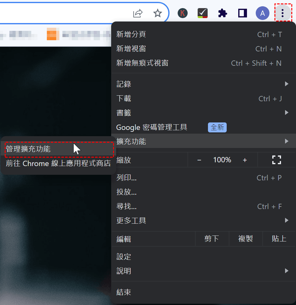 2、點擊右上方的⋮圖示,從選單中依次點擊“擴充功能” > “管理擴充功能”。