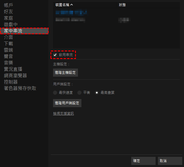 提示:您可以從【家中串流】部分進行【用戶端設定】,例如將調整畫質、限制顯示器解析度、頻寬、喇叭等,並允許您啟用【硬體解碼】。