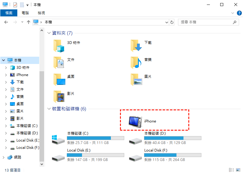 打開「檔案總管」 > 「這台電腦」,您會看到您的 iPhone 裝置圖示。然後,您可以隨意複製貼上檔案到 iPhone 裝置,就像在 Windows 電腦的其他磁碟一樣。