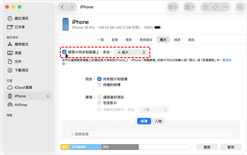 開啟「Finder」> 左側選擇iPhone > 選擇「照片」標籤頁 > 勾選「將照片同步到裝置上,來自」旁邊的註記框 > 選擇「照片」進行傳輸。