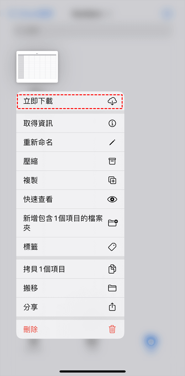 4、檢視之前上傳的照片,並選取想要傳輸的照片,用手指長按照片,從下拉式選單中選擇「立即下載」。