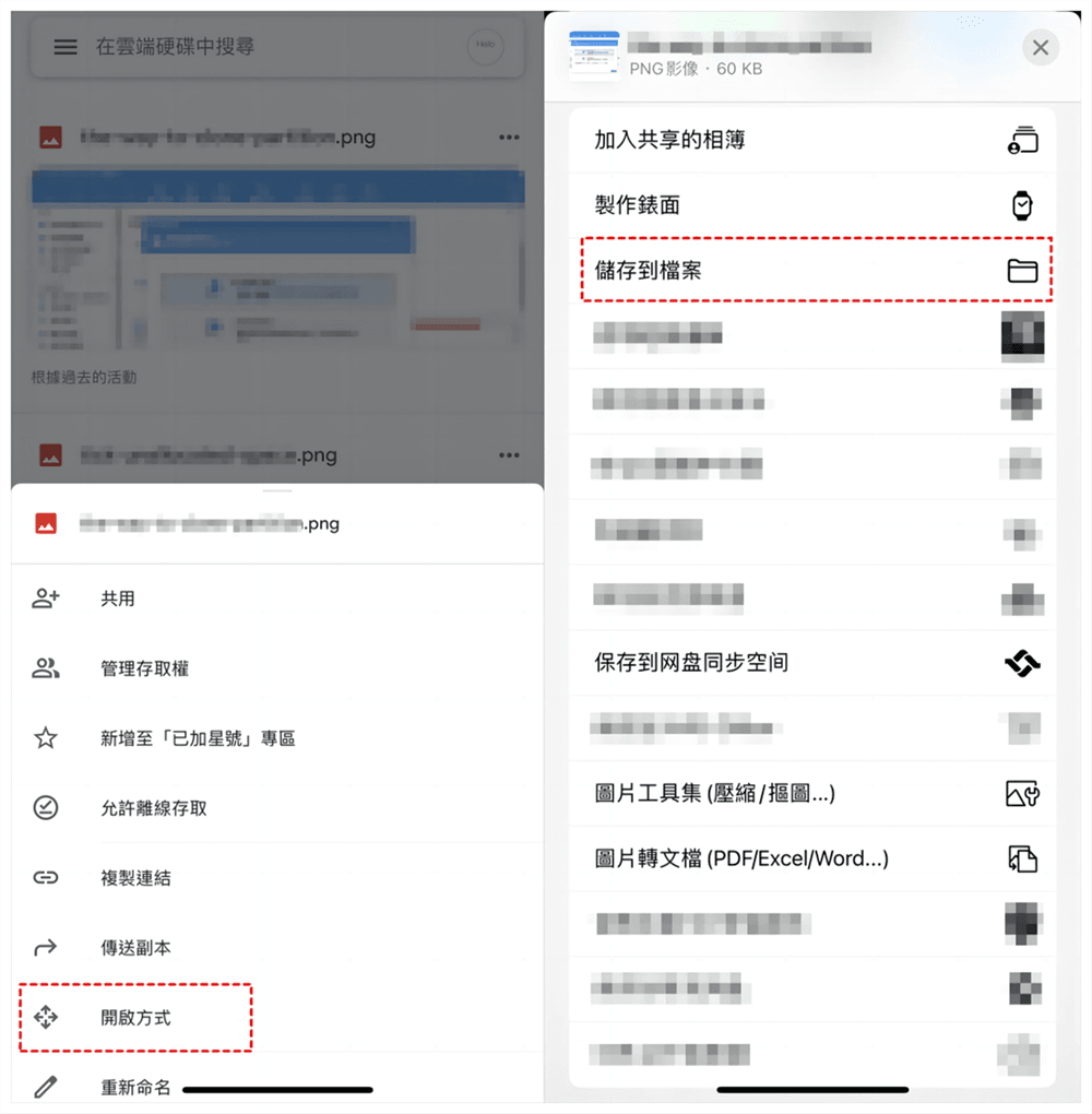 4、找到之前上傳的檔案,再點擊三個點圖示,從選單中點擊「開啟方式」 > 「儲存到檔案」,再按照步驟將檔案儲存到您的iPhone。