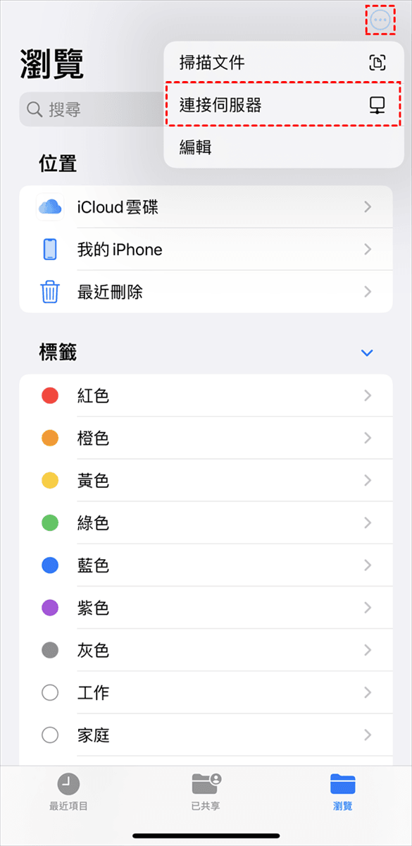 5、前往iPhone中內建的「檔案」應用程式,點擊右上角的三個點圖示,從下拉式選單中選擇「連接伺服器」。