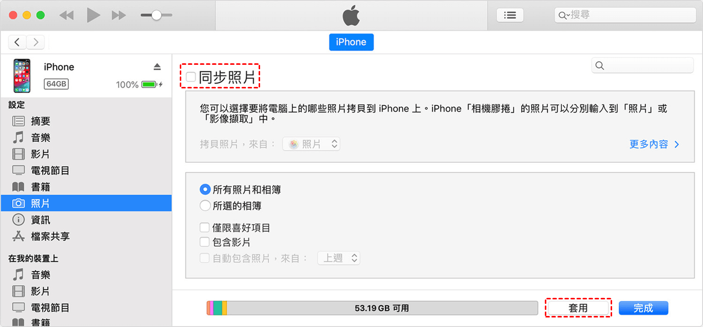 3、打開iTunes,點選您的iPhone,從左側選擇「照片」,從視窗右側勾選「同步照片」核取方塊,選取相簿或者所有照片,再單擊套用。