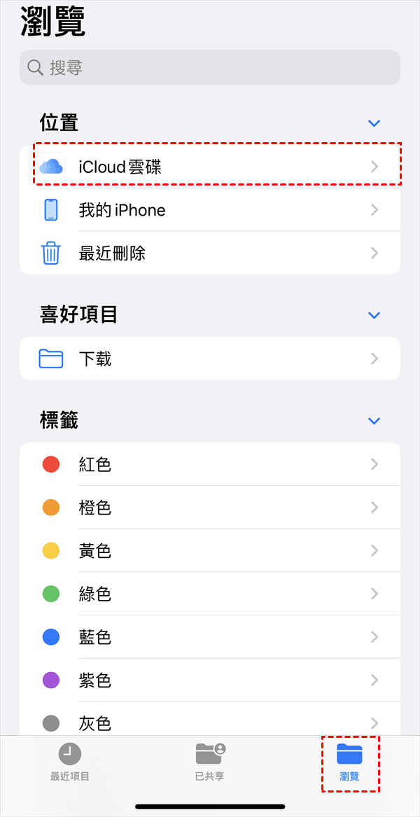 3、在iPhone上,打開「檔案」應用程式,依次單擊「瀏覽」 > 「iCloud雲碟」。