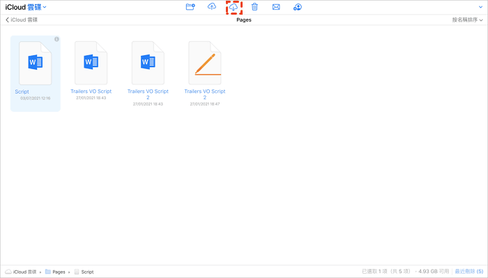 2、在iCloud雲碟主畫面,您會看到螢幕正上方的一排圖示。請單擊第二個上傳的圖示,並選擇想要傳輸的照片。