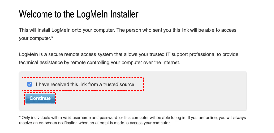 步驟6、然後,請勾選“我從可靠來源收到此連結”核取方塊,然後點擊“繼續”。您會收到一個提示,其中包括LogMeIn下載和安裝的相關說明。