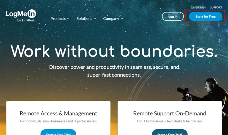 步驟1、從瀏覽器前往LogMeIn網站,並單擊瀏覽器視窗右上角的“免費開始”選項,並登入一個可用的帳戶。