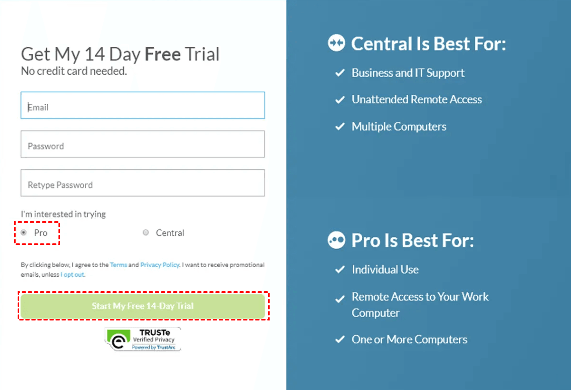 步驟2、請輸入您的電子郵件和密碼。然後,選擇“專業版”選項,並單擊“開啟我的14天免費試用”。
