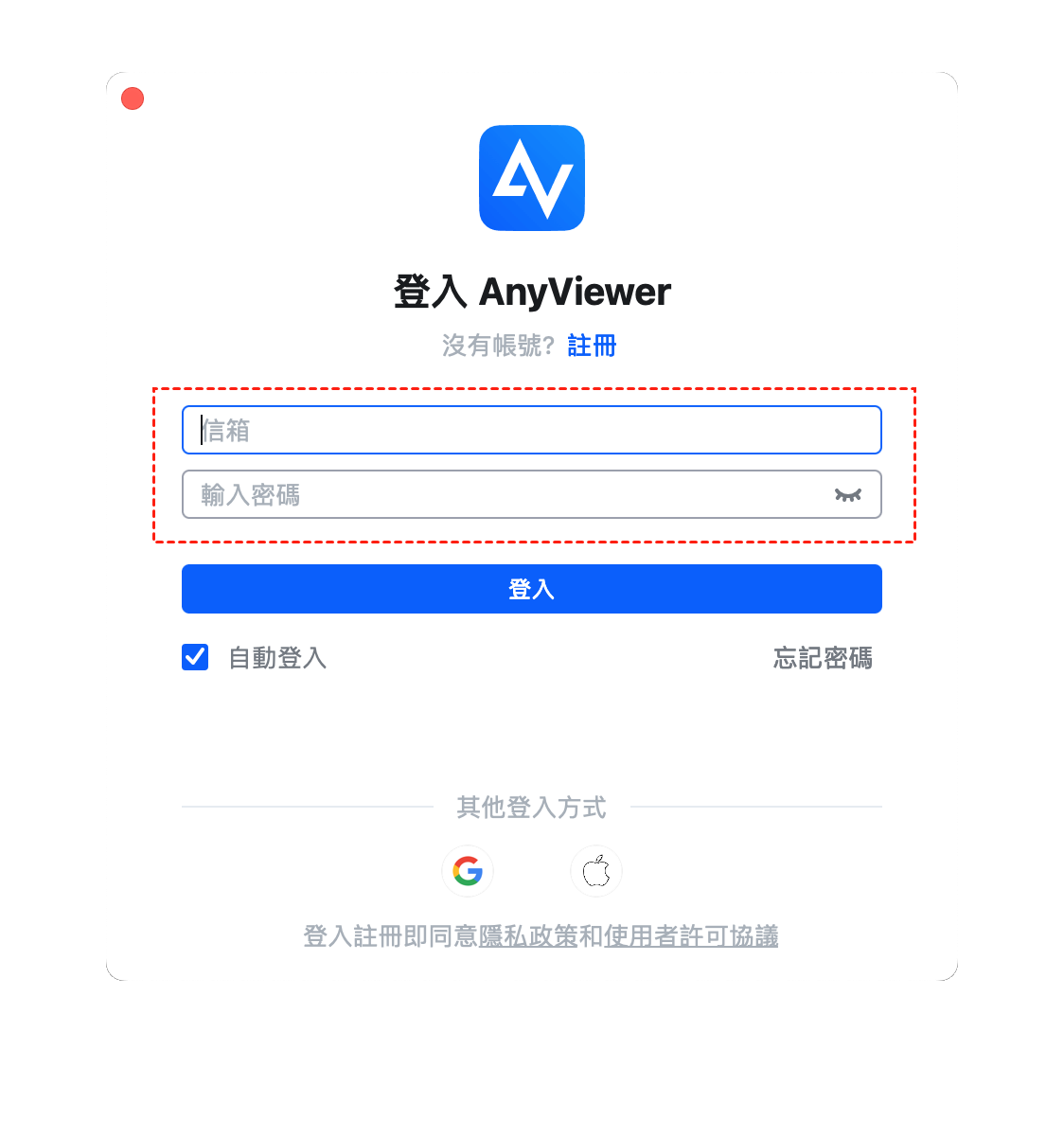步驟1.在Mac電腦上下載並安裝AnyViewer,開啟後進入「登入」視窗註冊一個帳戶(若已在官網註冊過可直接登入)。