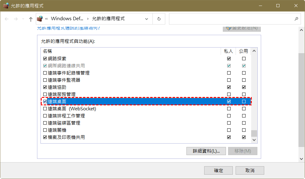 注意:當您發現遠端桌面無法連線這樣的問題時,可以再次檢查Windows Defender防火牆並確保「私人」與「公用」核取方塊已被勾選。