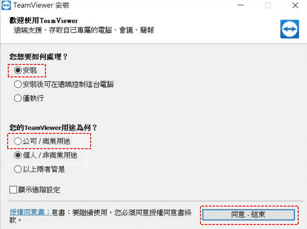 步驟1:在遠端裝置和本地裝置上下載和安裝TeamViewer,然後選擇您下載軟體的目的(企業)。