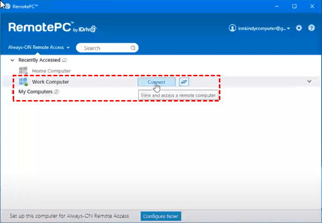 步驟3、在本地電腦上,打開RemotePC,登入帳戶並找到所需的遠端電腦。點擊「連線」,並在彈出窗口中輸入遠端電腦的個人密鑰,建立遠端連線。