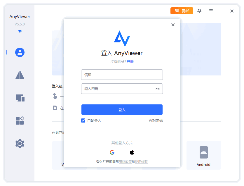 打開電腦端的AnyViewer,點「登入」→「註冊」,用 Email 建立一個免費帳號。登入後,這台電腦就會綁定在你的帳號底下。