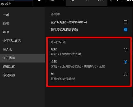 - Tip 2:預設情況下,Game Bar不錄製麥克風聲音。要到「設定」→「遊戲」→「螢幕擷取」→「錄製音訊」並勾選「當我錄製遊戲時錄製麥克風」。