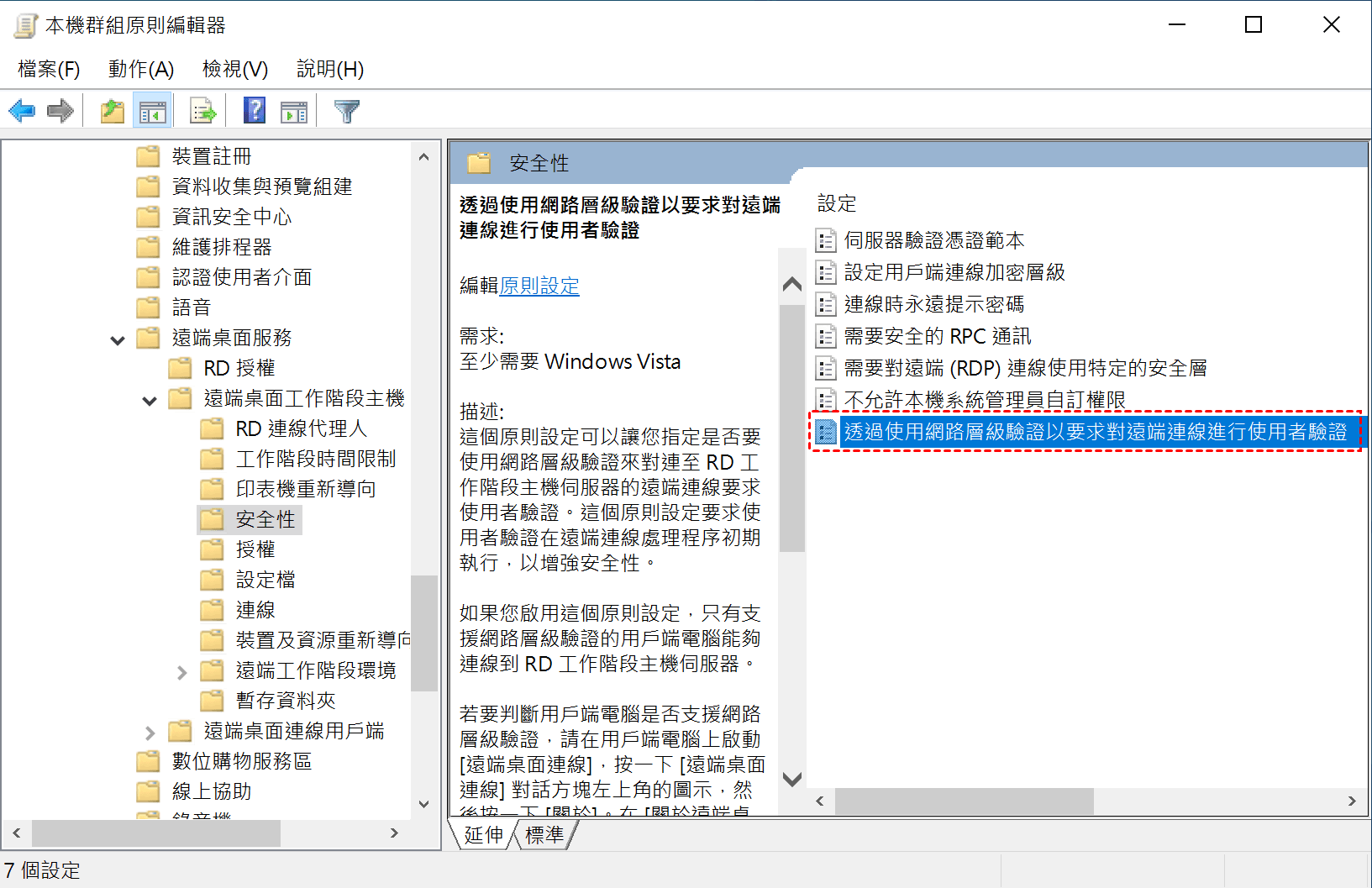 電腦設定 > 系統管理範本 > Windows元件 > 遠端桌面服務 > 遠端桌面工作階段主機 > 安全性。