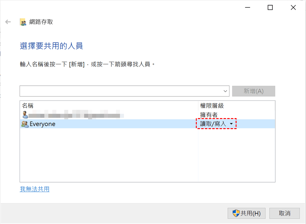 步驟5、然後,您需要選擇“Everyone”並將權限變更為“讀取/寫入”,然後點擊“共用”進行確認。
