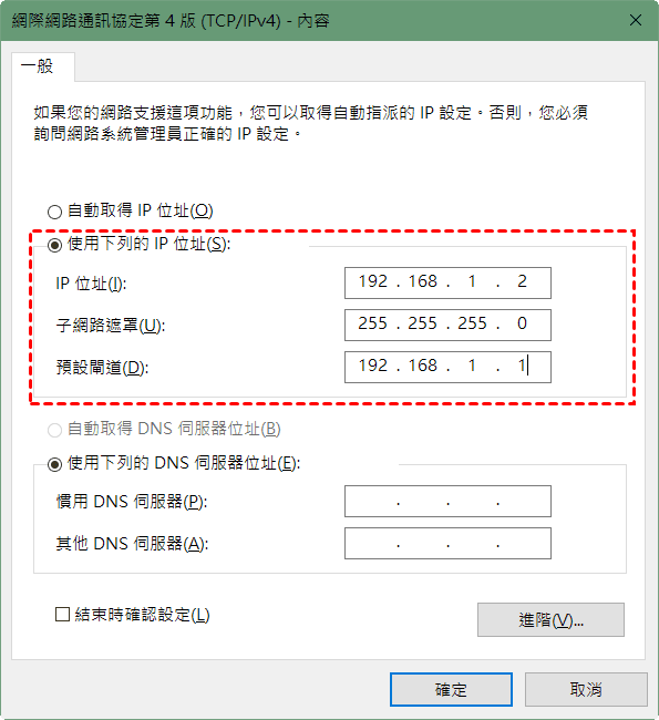 7、選擇「使用下列的IP位址」,並按照以下方法進行設定: