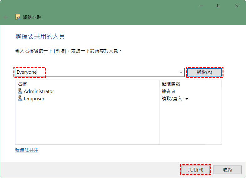 11、在「網路存取」視窗中,選擇「Everyone」並單擊「新增」,再單擊「共用」。
