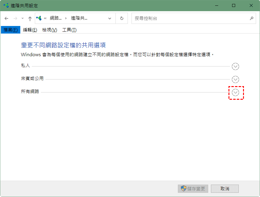 開啟共用,只讓具有網路存取權的人員讀取和寫入公用資料夾中的檔案。