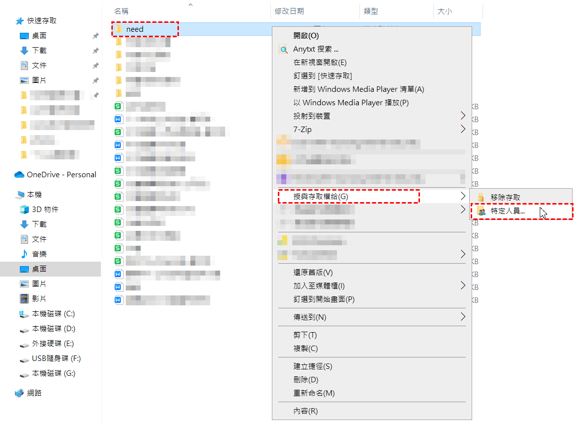 10、右鍵單擊想要傳輸的資料夾,依次選擇「授與權限給」 > 「特定人員」。