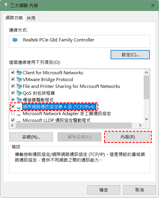 6、在彈出的視窗中,選擇「網際網路通訊協定第4版(TCP/IPv4)」,再單擊「內容」。