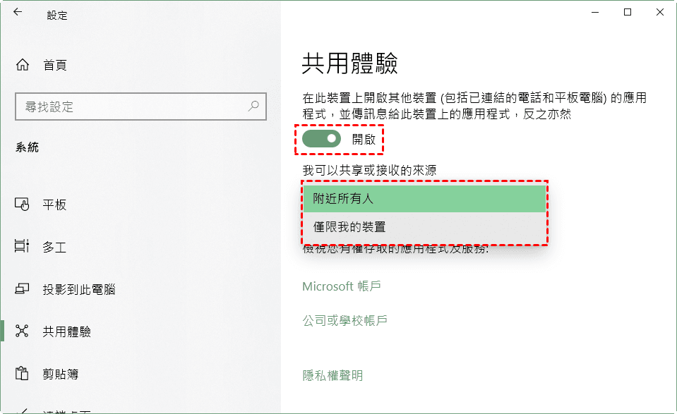 小貼士:「僅限我的裝置」意味著您的電腦只能與相同Microsoft帳戶的裝置共用。「附近所有人」則意味著您的電腦可以共享或接收附近所有裝置的內容。
