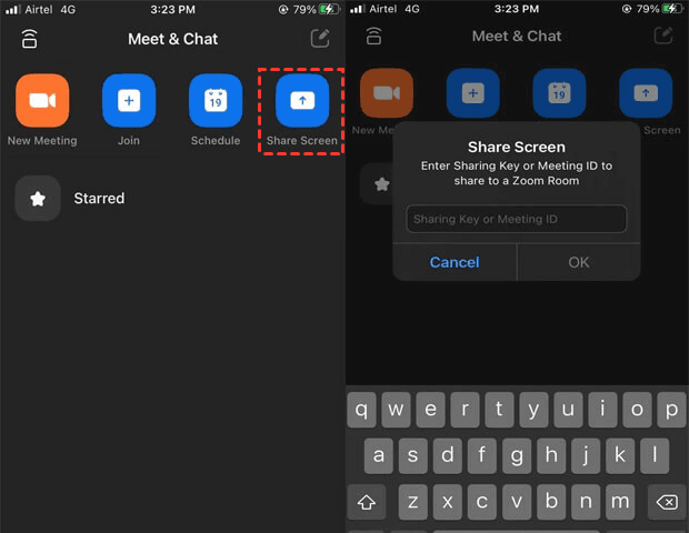 步驟3、從您的iPhone上登入Zoom,並選擇“分享畫面”。輸入從Windows電腦上獲取到的密鑰或會議ID。
