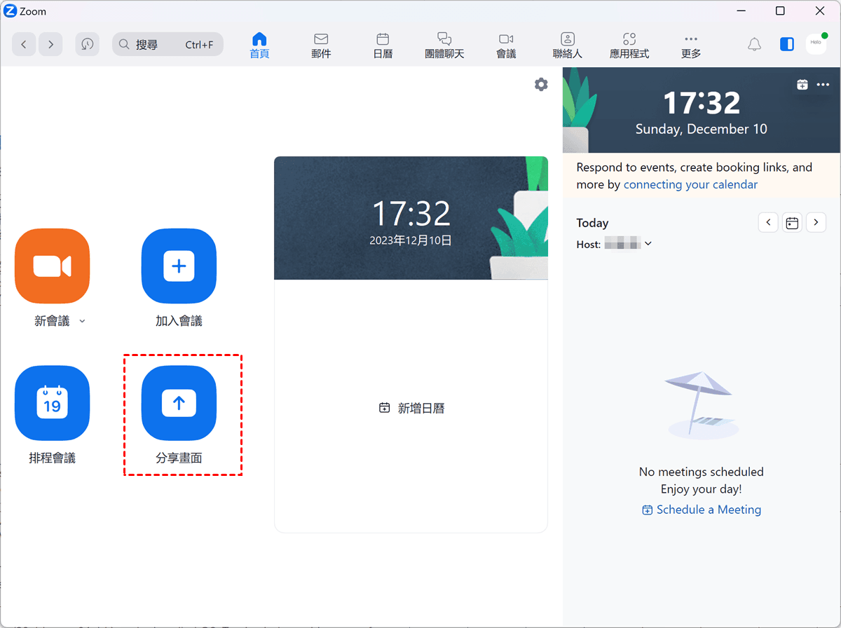 步驟2、在控制裝置上登入Zoom,並開啟一個會議,再選擇“分享畫面”。