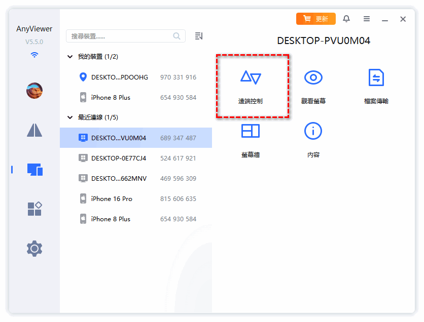 步驟3.在目前電腦的「裝置」頁籤,點選要控制的電腦,選擇「遠端控制」。
