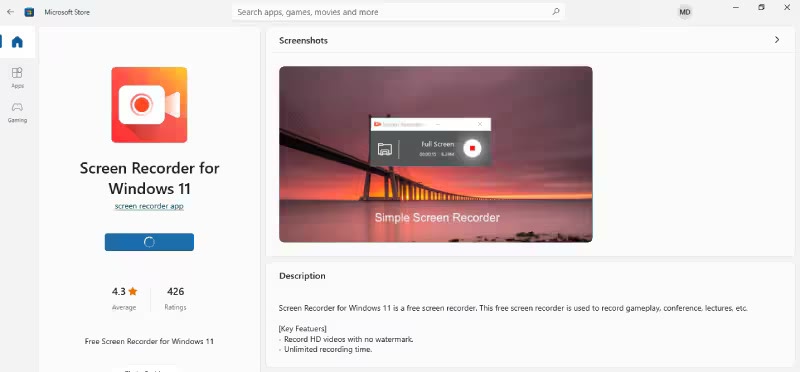 步驟1.從Microsoft Store搜尋並安裝「Screen Recorder for Windows 11」。