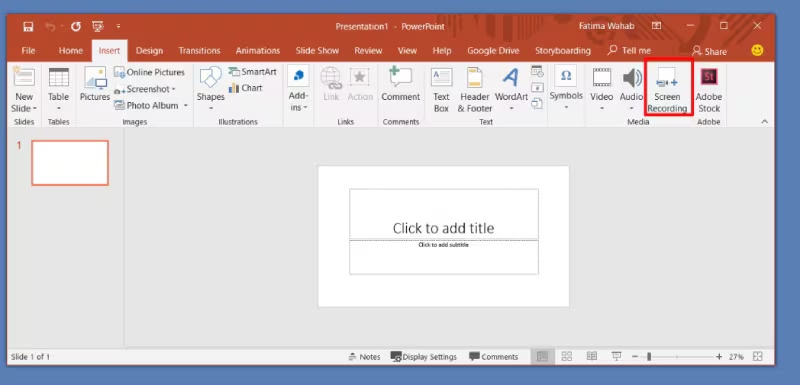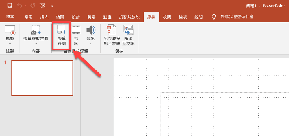 步驟1.開啟PowerPoint,前往「插入」分頁 >「螢幕錄影」。